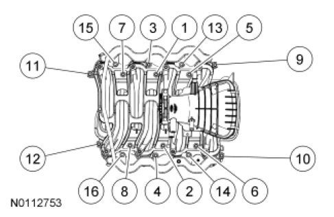Stage 1: Tighten the 12 intake manifold bolts to 10 Nm (89 lb-in).