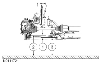 1. Measure the distance between the flat level surface and the forward lower arm inboard bolt (measurement 2).