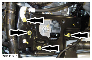 5. Remove the selector lever cable bracket bolt, the battery tray bracket nuts and the battery tray bracket.