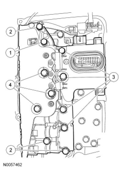 7. NOTICE: Make sure not to pinch the Turbine Shaft Speed (TSS), Output Shaft Speed (OSS) or Transmission Range (TR) sensor wiring harnesses when installing the solenoid body. Damage to the wiring harness will occur.