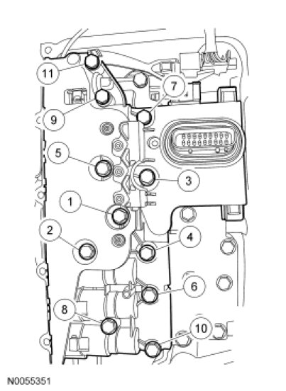 5. Install the TR sensor detent spring and the 10 bolts. Tighten the valve body bolts in the sequence shown.