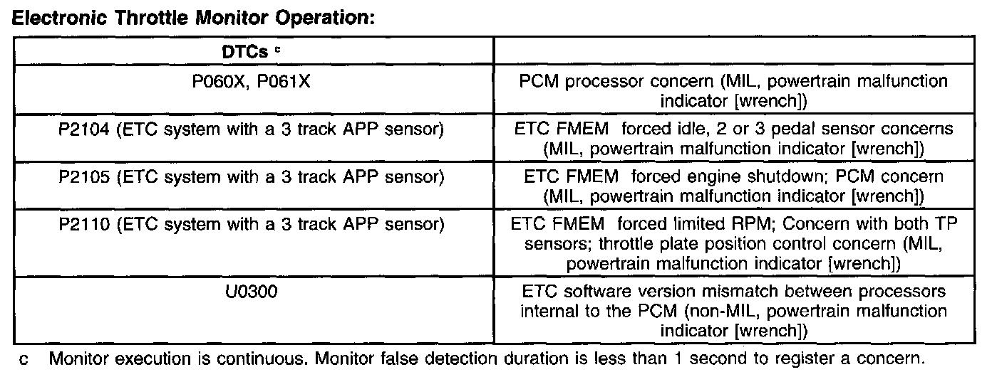 The ETC monitor system is distributed across 2 processors within the PCM: the main powertrain control processor unit (CPU) and a separate monitoring processor. The primary monitoring function is carried out by the independent plausibility checker (IPC) software, which resides on the main processor. It is responsible for determining the driver-demanded torque and comparing it to an estimate of the actual torque delivered. If the generated torque exceeds driver demand by a specified amount, appropriate corrective action is taken.