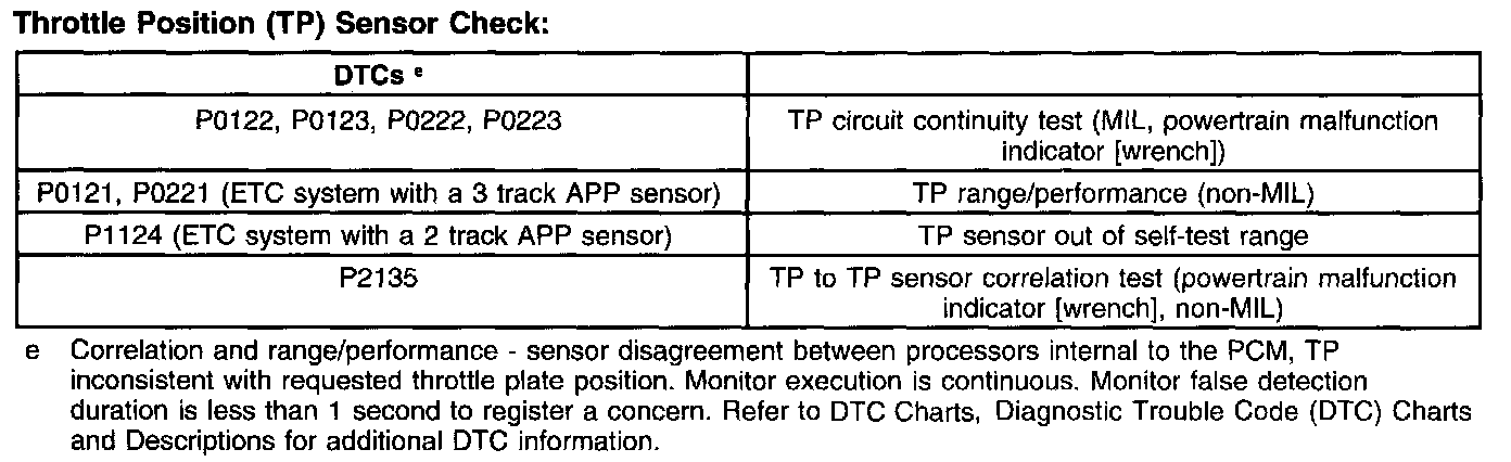 - There is one reference voltage and one signal return circuit between the PCM and the ETB. The reference voltage and the signal return circuits are shared with the reference voltage and signal return circuits used by the accelerator pedal position (APP) sensor. There are also 2 throttle position (TP) signal circuits for redundancy. The redundant TP signals are required for increased monitoring reasons. The first TP signal (TPS1-NS) has a negative slope (increasing angle, decreasing voltage) and the second signal (TPS2-PS) has a positive slope (increasing angle, increasing voltage). The TPS2-PS signal reaches a limit of approximately 4.5 volts at approximately 45 degrees of throttle angle.