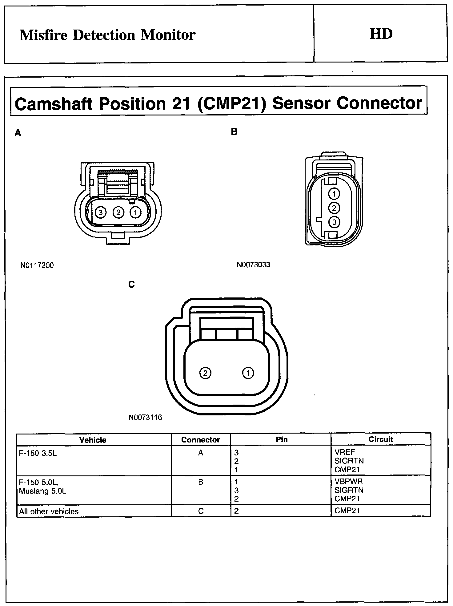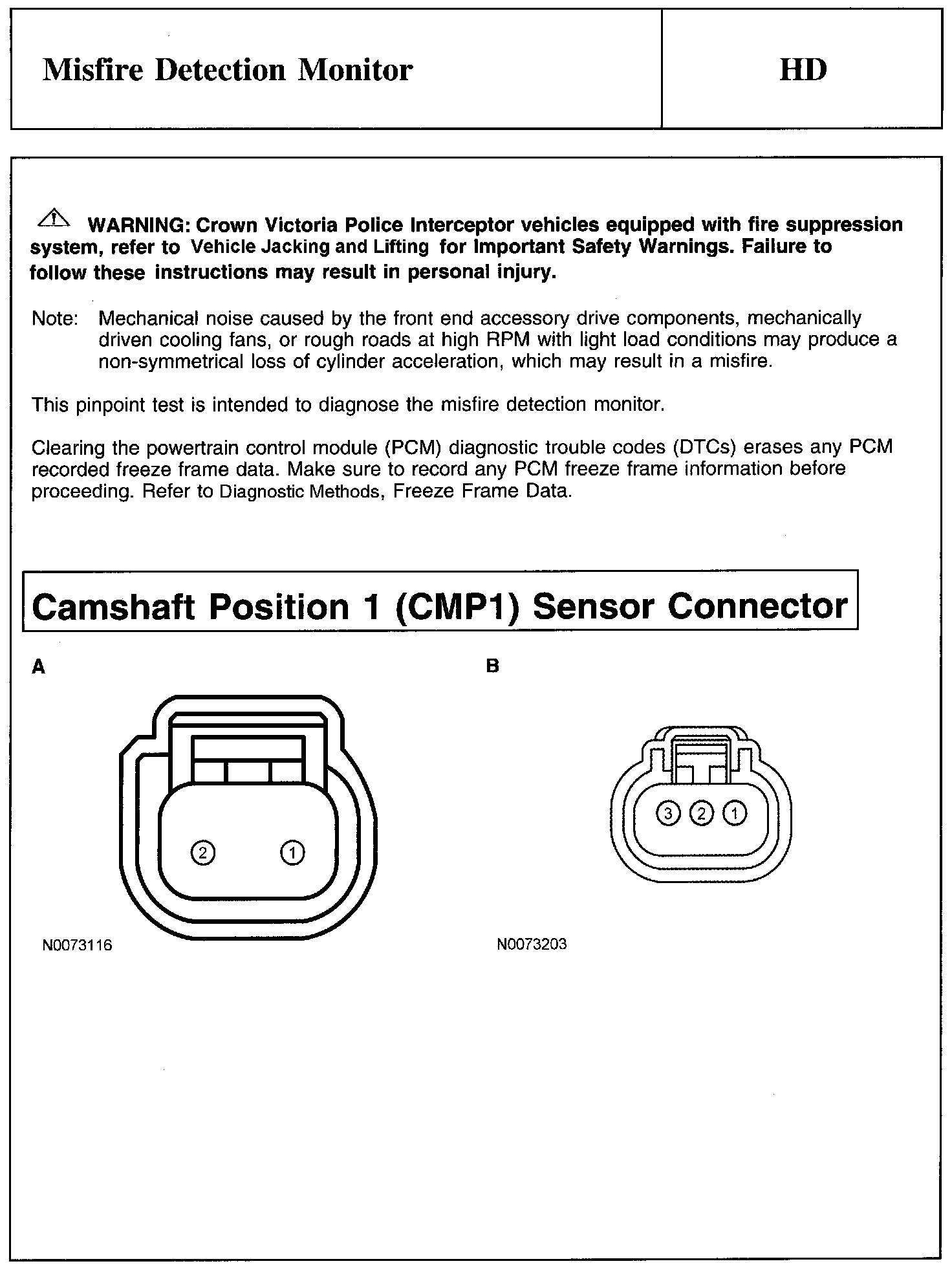 PINPOINT TEST HD: MISFIRE DETECTION MONITORWarning, Note And Camshaft Position 1 (CMP1) Sensor Connector: