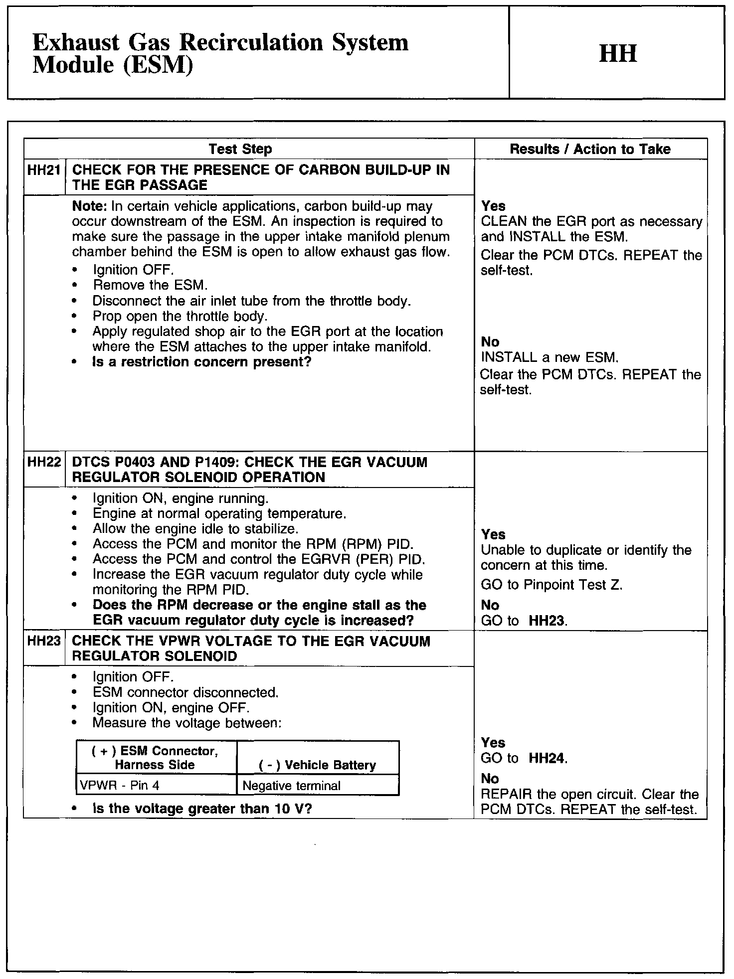 Home >> Ford >> 2011 >> Focus L4-2.0L >> Repair and Diagnosis >> Powertrain Management >> Computers and Control Systems >> Testing and Inspection >> Pinpoint Tests >> Test HH: Exhaust Gas Recirculation System Module (ESM)