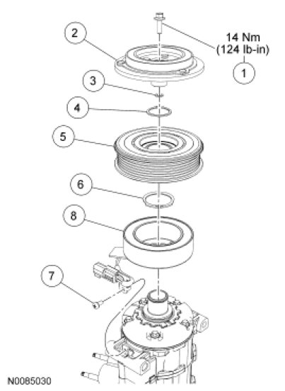 1. Remove the A/C compressor. For additional information, refer to Air Conditioning (A/C) Compressor - 2.5L Service and Repair or Air Conditioning (A/C) Compressor - 3.0L, 3.5L Service and Repair.