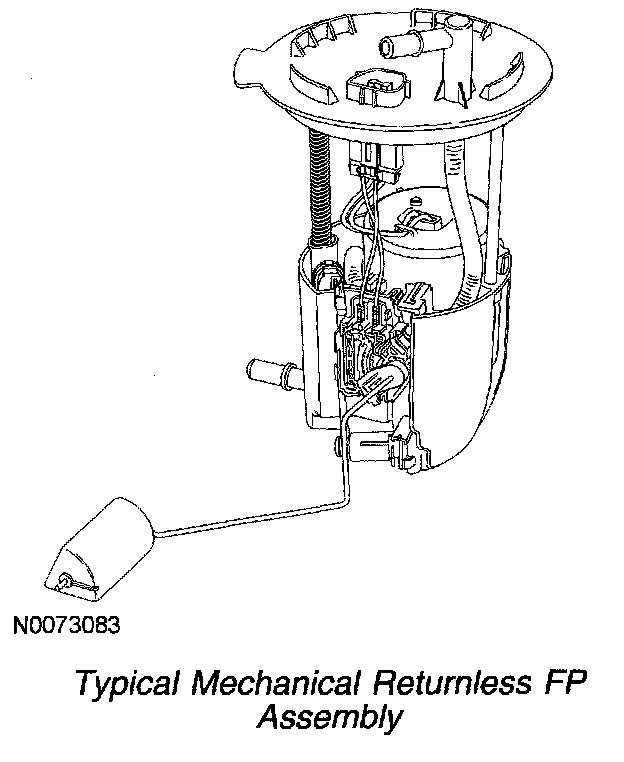 The FP assembly is mounted inside the fuel tank in a reservoir. The pump has a discharge check valve that maintains the system pressure after the ignition has been turned OFF to minimize starting concerns. The reservoir prevents fuel flow interruptions during extreme vehicle maneuvers with low tank fill levels.