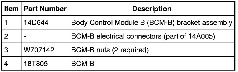NOTE: Prior to the removal of the module, it is necessary to upload the module configuration information to a scan tool. This information must be downloaded into the new Body Control Module B (BCM-B) after installation. For additional information, refer to Module Configuration Programmable Module Installation (PMI).