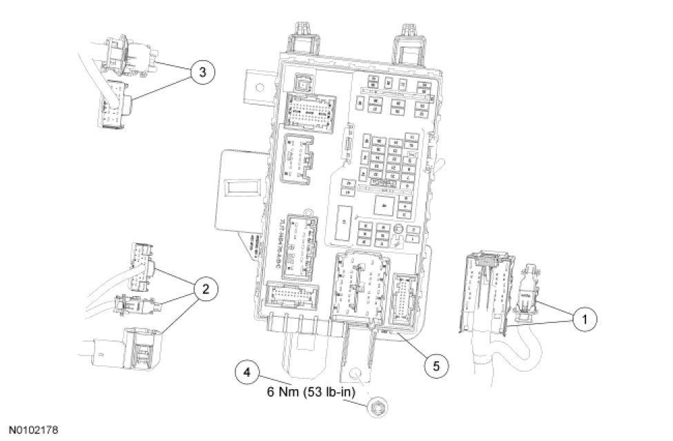 NOTE: Prior to the replacement of the module, it is necessary to upload the module configuration information to a scan tool. This information must be downloaded into the new Smart Junction Box (SJB) after installation. For additional information, refer to Module Configuration Programmable Module Installation (PMI) to carry out Programmable Module Installation (PMI).
