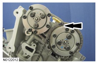 Align the colored link on the timing chain with the timing mark on the LH VCT assembly.