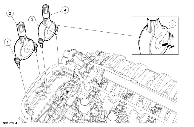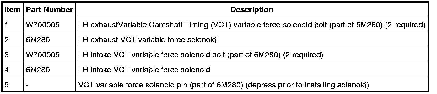 NOTICE: The Variable Camshaft Timing (VCT) variable force solenoid pins must be fully depressed to avoid interference with the VCT valve tips during installation. Failure to follow these instructions can result in damage to the engine.