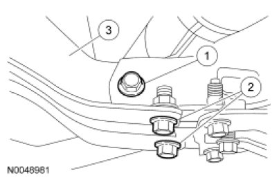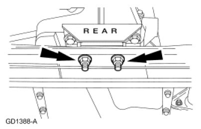 2. Remove the 2 transmission mount nuts from the transmission support crossmember. Discard the nuts.