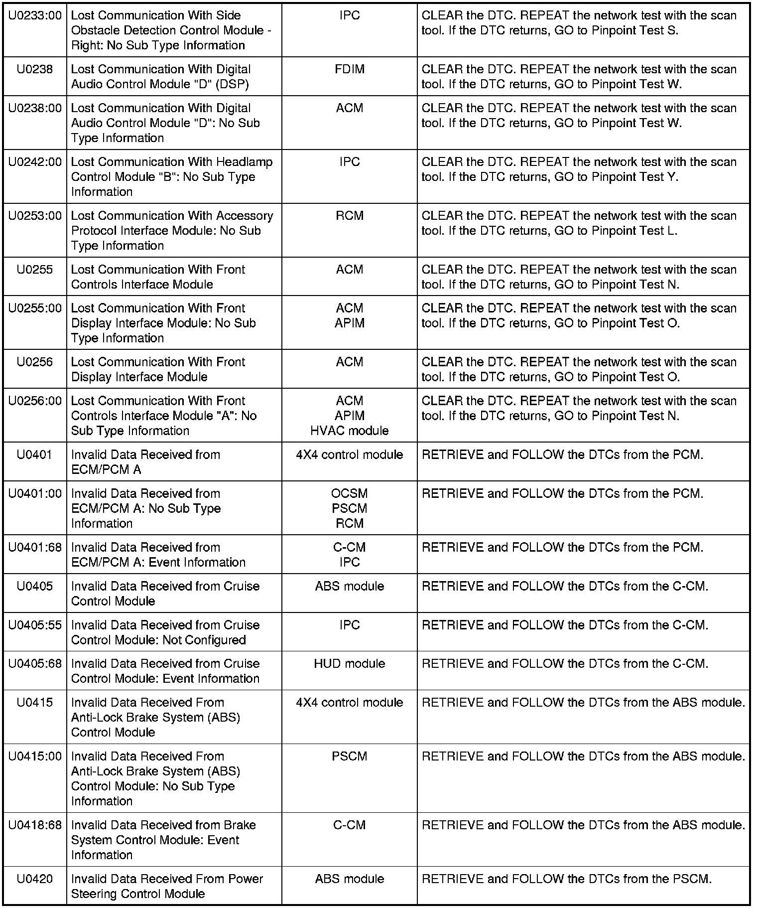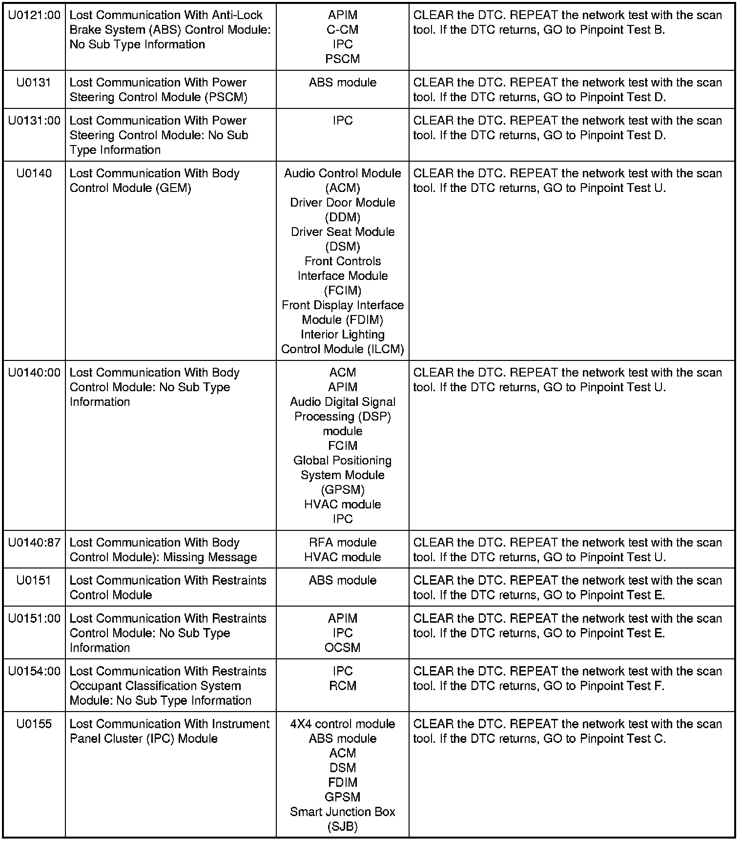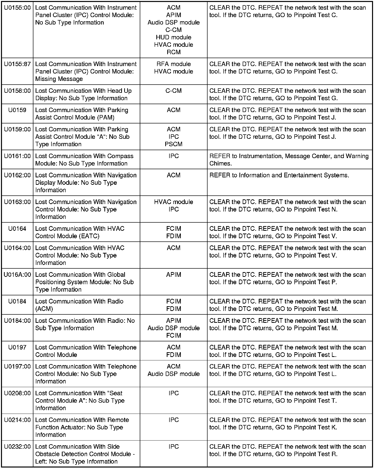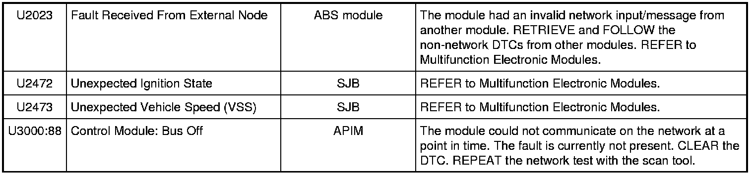 NOTE: Network DTCs (U-codes) are often a result of intermittent concerns such as damaged wiring or low battery voltage occurrences. Additionally, vehicle repair procedures such as module reprogramming often sets network DTCs. Replacing a module to resolve a network DTC is unlikely to resolve the concern. To prevent repeat network DTC concerns, inspect all network wiring, especially connectors. Test the vehicle battery, refer to Battery, Mounting and Cables Testing and Inspection.