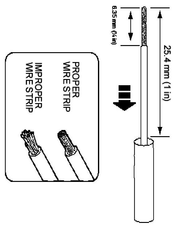 2. Strip 6.35mm (1/4 in) of insulation from each wire end, taking care not to nick or cut wire strands.