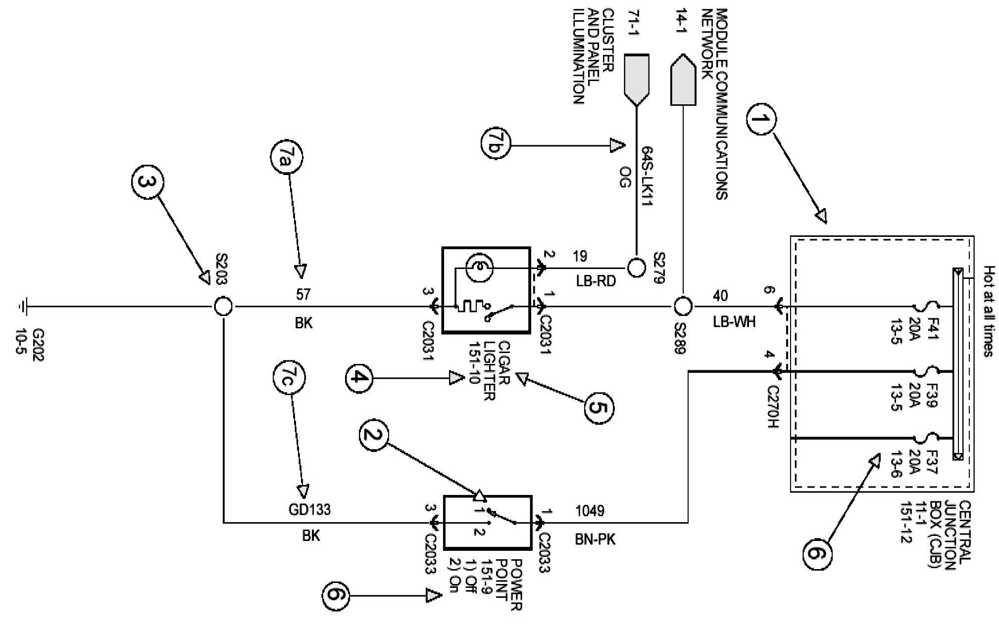 Ford Motor Company uses three different circuit numbering conventions: Standard Circuit Numbering System, Global Circuit Numbering System, and New Global Circuit Numbering System (NGCNS). With each, the circuit number (which identifies a specific circuit function) is followed by the wire color.