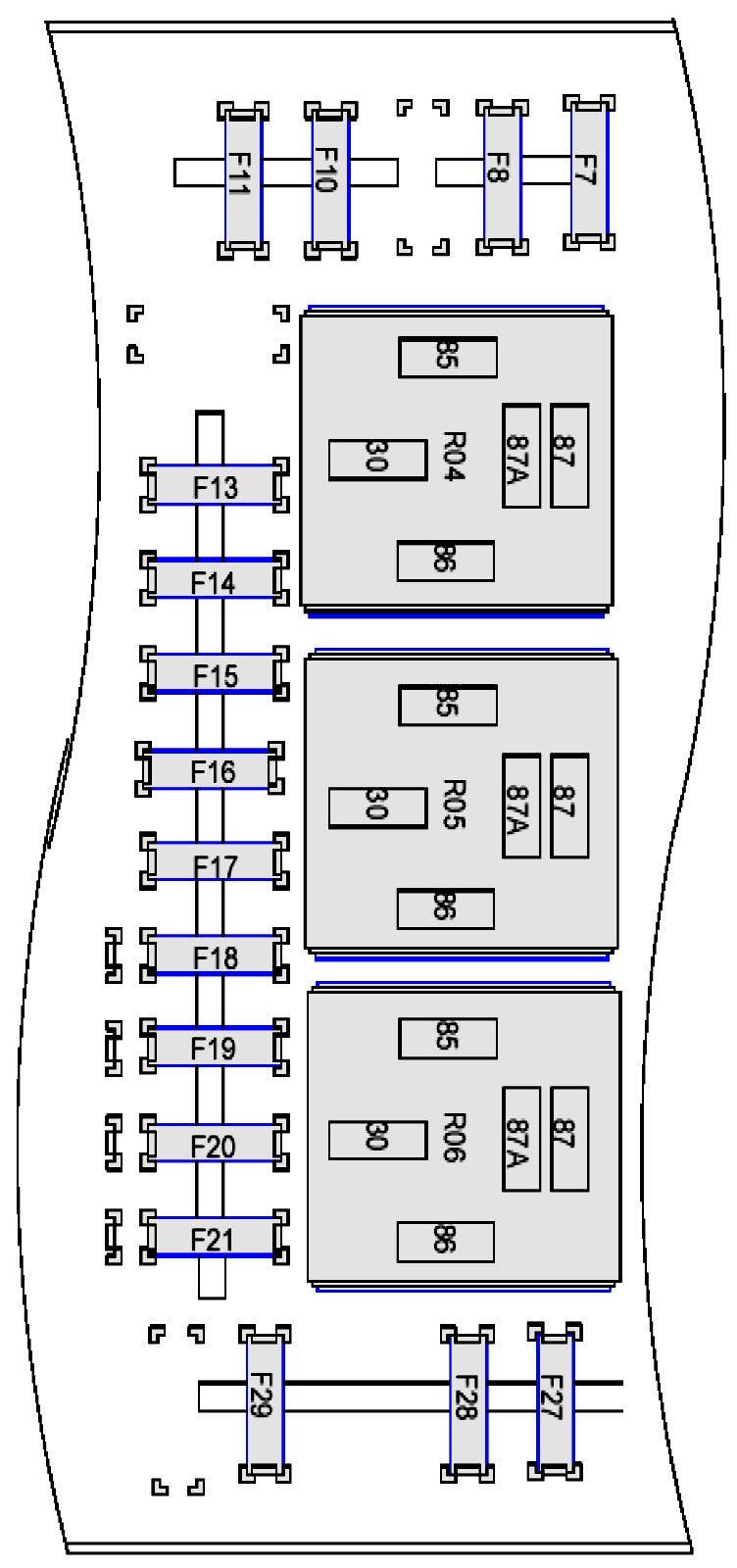Fuse/Locations and Relay/Locations contains a view of the fuse/relay box, in which all fuses and relays are identified, numbered and named. Fuse and relay numbering and naming follow the indication of the fuse panel cover. In addition, for all removable relays, pin positions are added to illustrate proper orientation.
