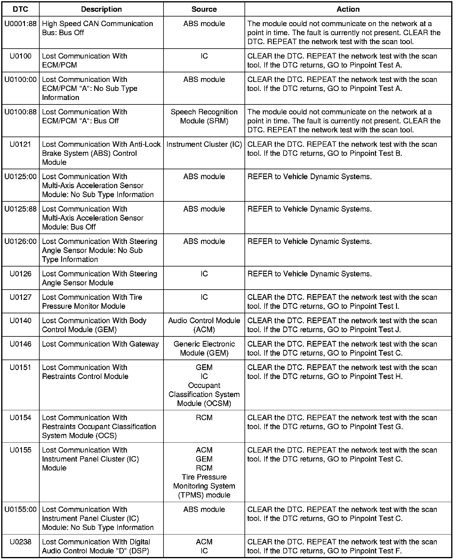 NOTE: Network DTCs (U-codes) are often a result of intermittent concerns such as damaged wiring or low battery voltage occurrences. Additionally, vehicle repair procedures such as module reprogramming often set network DTCs. Replacing a module to resolve a network DTC is unlikely to resolve the concern. To prevent repeat network DTC concerns, inspect all network wiring, especially connectors. Test the vehicle battery, refer to Battery, Mounting and Cables Testing and Inspection.
