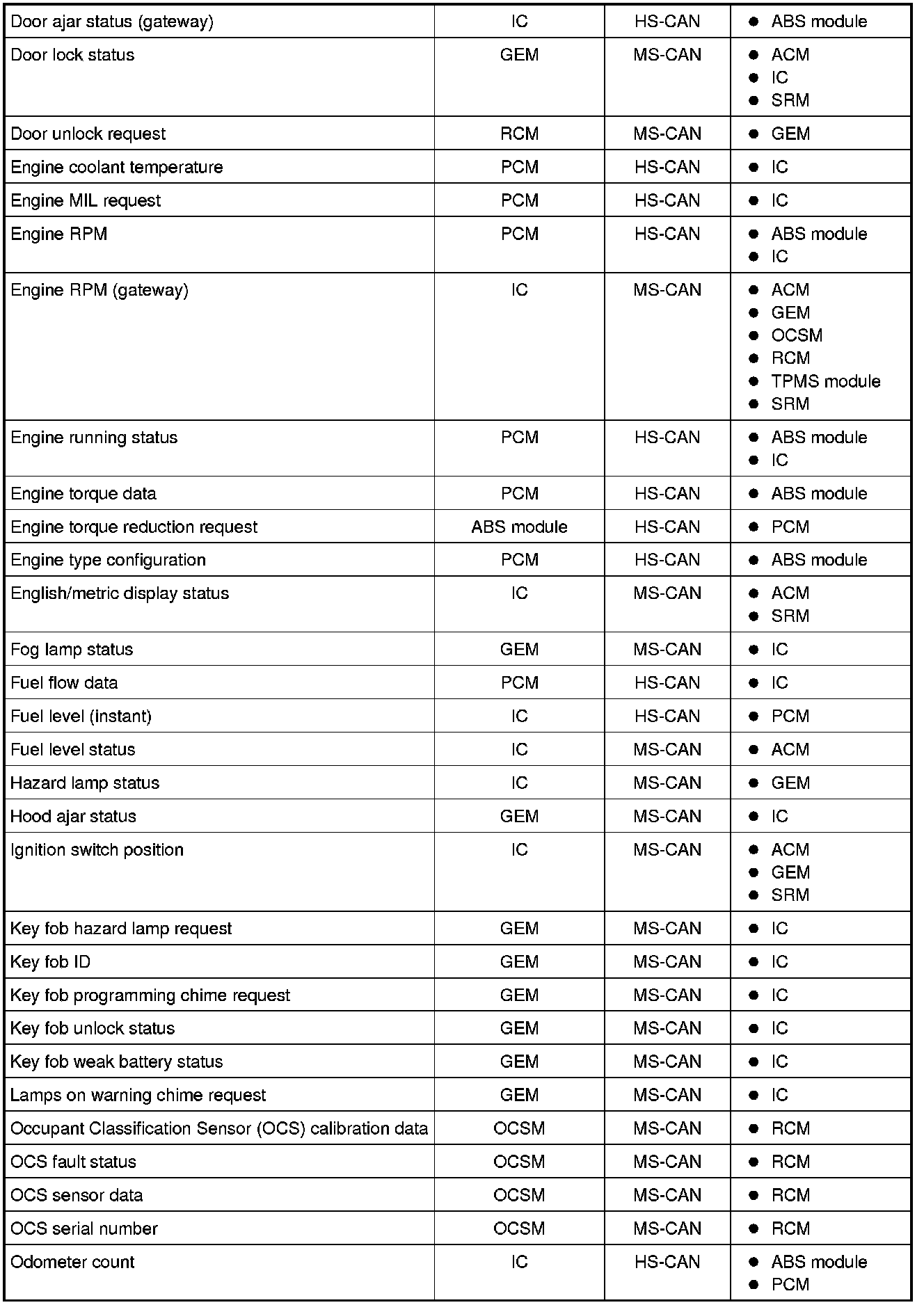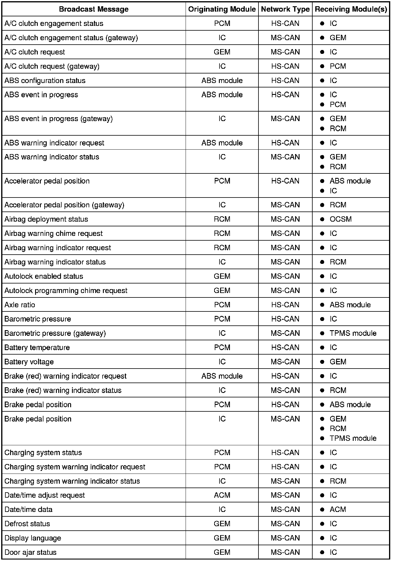 NOTE: This chart describes the specific HS-CAN and MS-CAN messages broadcast by each module, and the module(s) that receive the message.