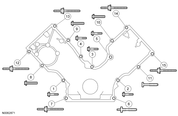 Tighten the 15 engine front cover fasteners in the sequence shown to