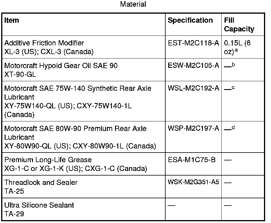 a For a complete refill on Model 60 axles equipped with a limited slip differential, add 0.15L (6 oz) of Additive Friction Modifier XL3 meeting Ford specification EST-M2C118-A to lubricant. Model 70 axles equipped with a limited-slip differential have carbon-fiber clutch discs that do not require any friction modifier.