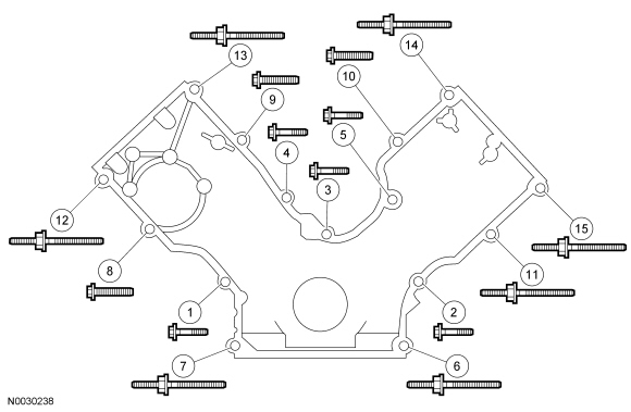 Tighten the engine front cover fasteners in the sequence shown in 2 stages.