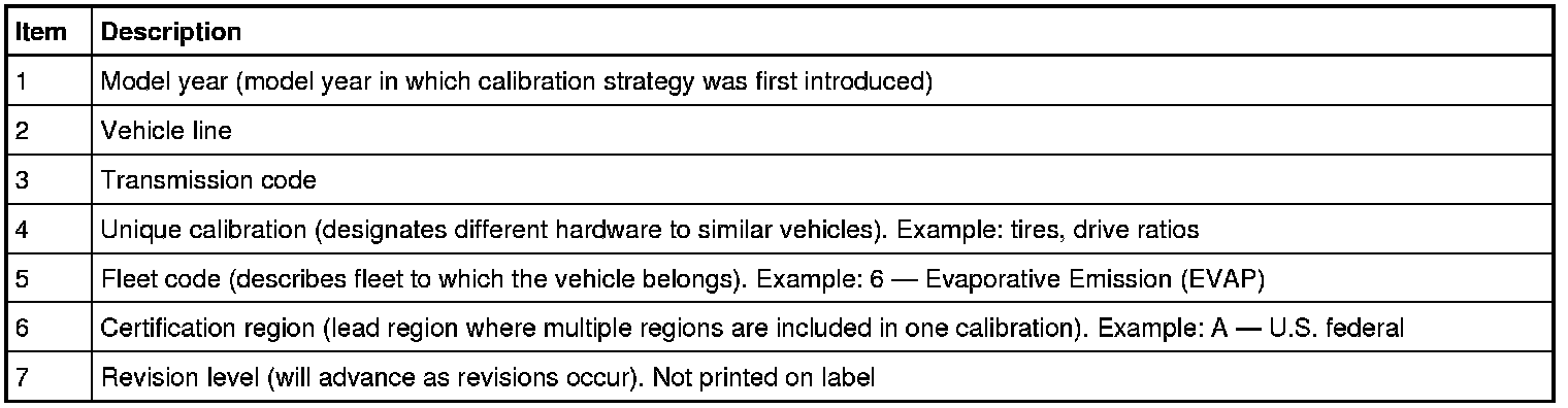 NOTE: Powertrain calibration information is limited to a maximum of 5 characters per line on the Vehicle Certification (VC) label. Because of this, calibration identification consisting of more than 5 characters will wrap to the second line on the VC (Vehicle Certification) label.