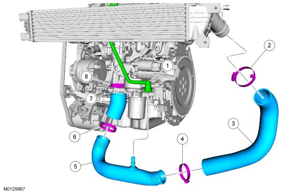 NOTE: Securely seal the Charge Air Cooler (CAC) tubes-to-turbocharger to prevent unmetered air from entering the engine or pressurized air from escaping.