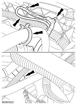 14. If equipped, detach the engine block heater harness from the radiator support, the A/C suction tube and the engine wiring harness.