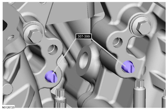 - Apply a 5.5 mm (0.21 in) bead of Motorcraft(R) High Performance Engine RTV Silicone to the oil pan-to-cylinder block joint and the cylinder head-to-cylinder block joint areas of the engine front cover in 5 places as indicated.