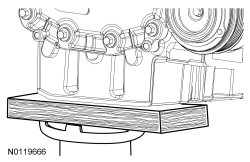28. NOTICE: Failure to position the wood block and floor jack as illustrated can result in damage to the oil pan.