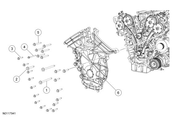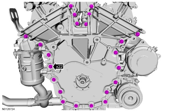 NOTE: The engine front cover and bolts 7, 8, 15, 17, 18, 21 and 22 must be installed within 4 minutes of the initial sealant application. The remainder of the engine front cover bolts must be installed and tightened within 35 minutes of the initial sealant application. If the time limits are exceeded, the sealant must be removed, the sealing area cleaned and sealant reapplied. To clean the sealing area, use silicone gasket remover and metal surface prep. Failure to follow this procedure can cause future oil leakage.