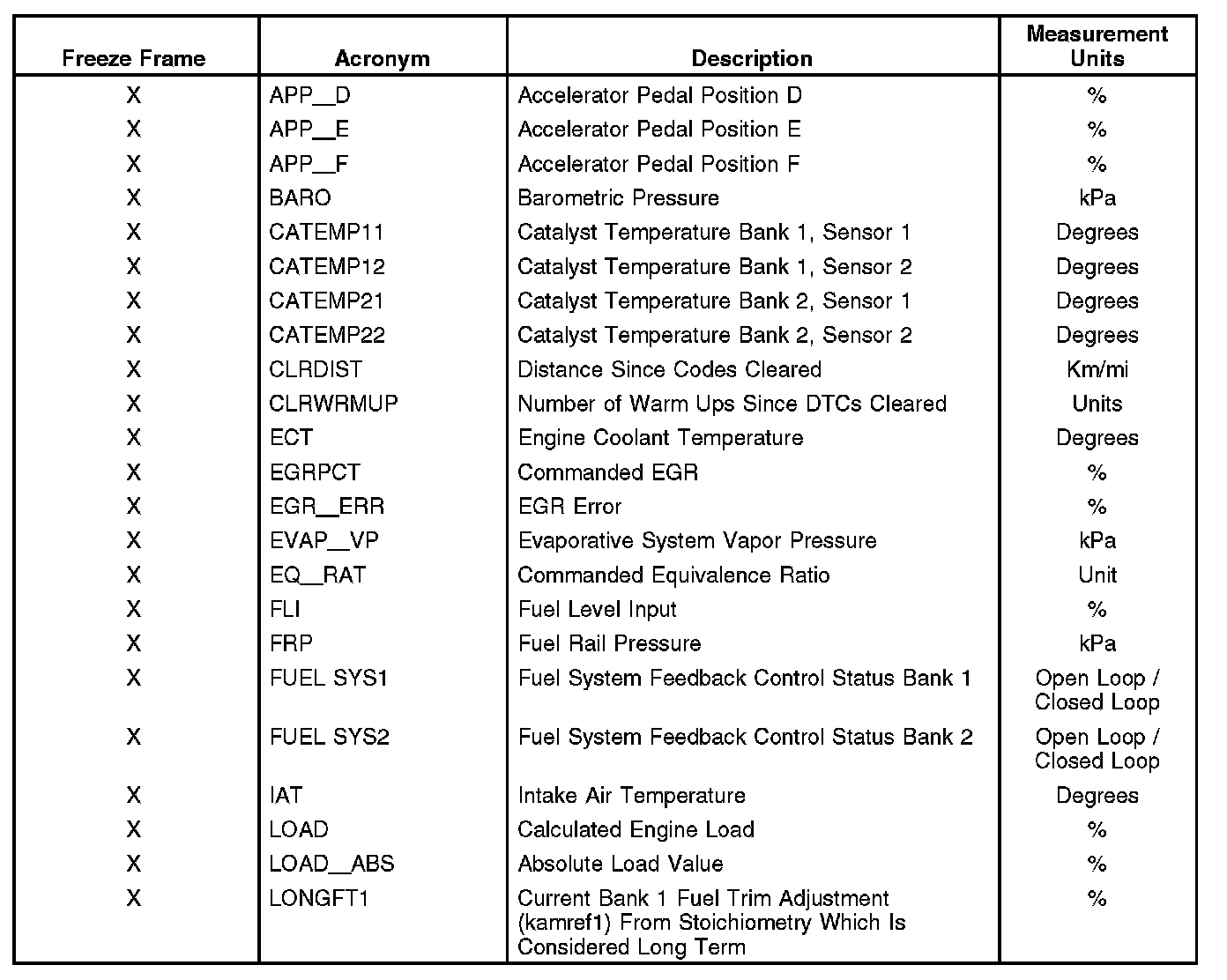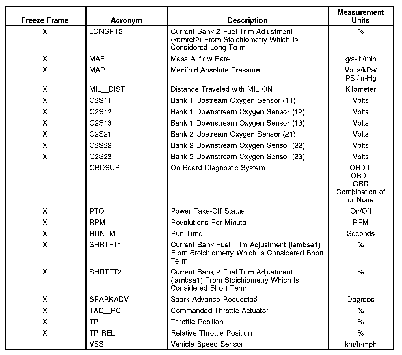 An X in the Freeze Frame column denotes both a mode 1 and mode 2 PID (real time and freeze frame).