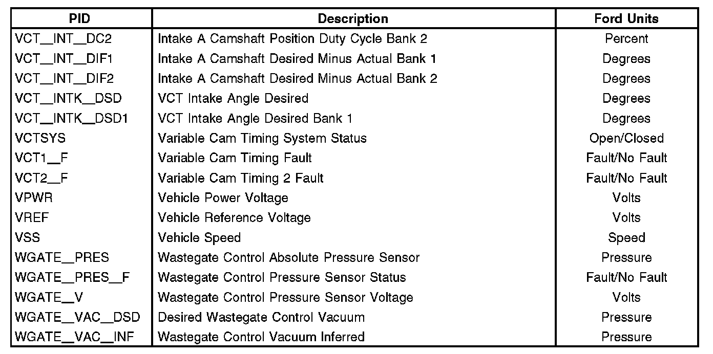 Home >> Ford >> 2012 >> Edge FWD V6-3.7L >> Repair and Diagnosis >> Powertrain Management >> Computers and Control Systems >> Testing and Inspection >> Scan Tool Testing and Procedures >> Parameter Identification (PID)