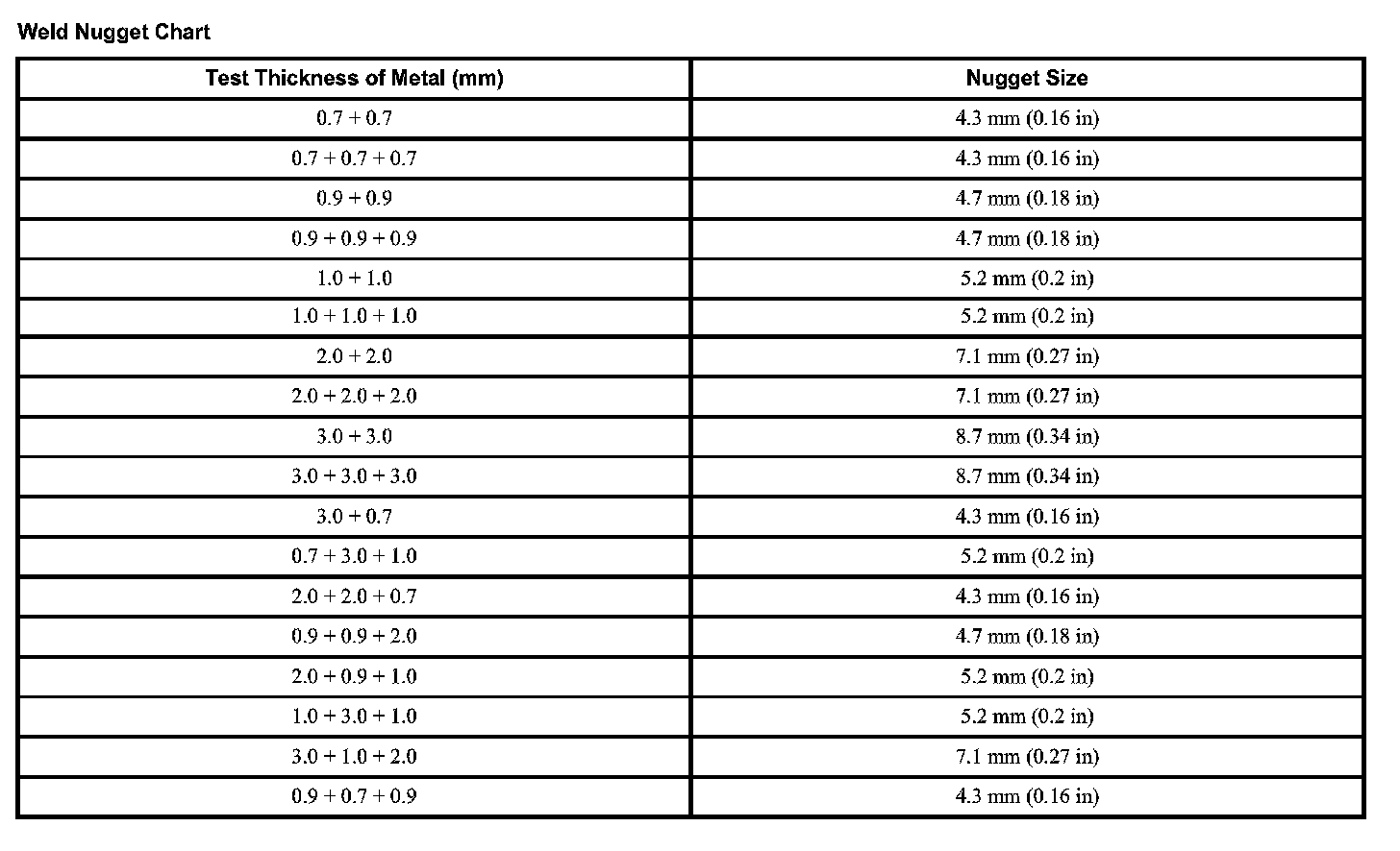 Weld Nugget Chart