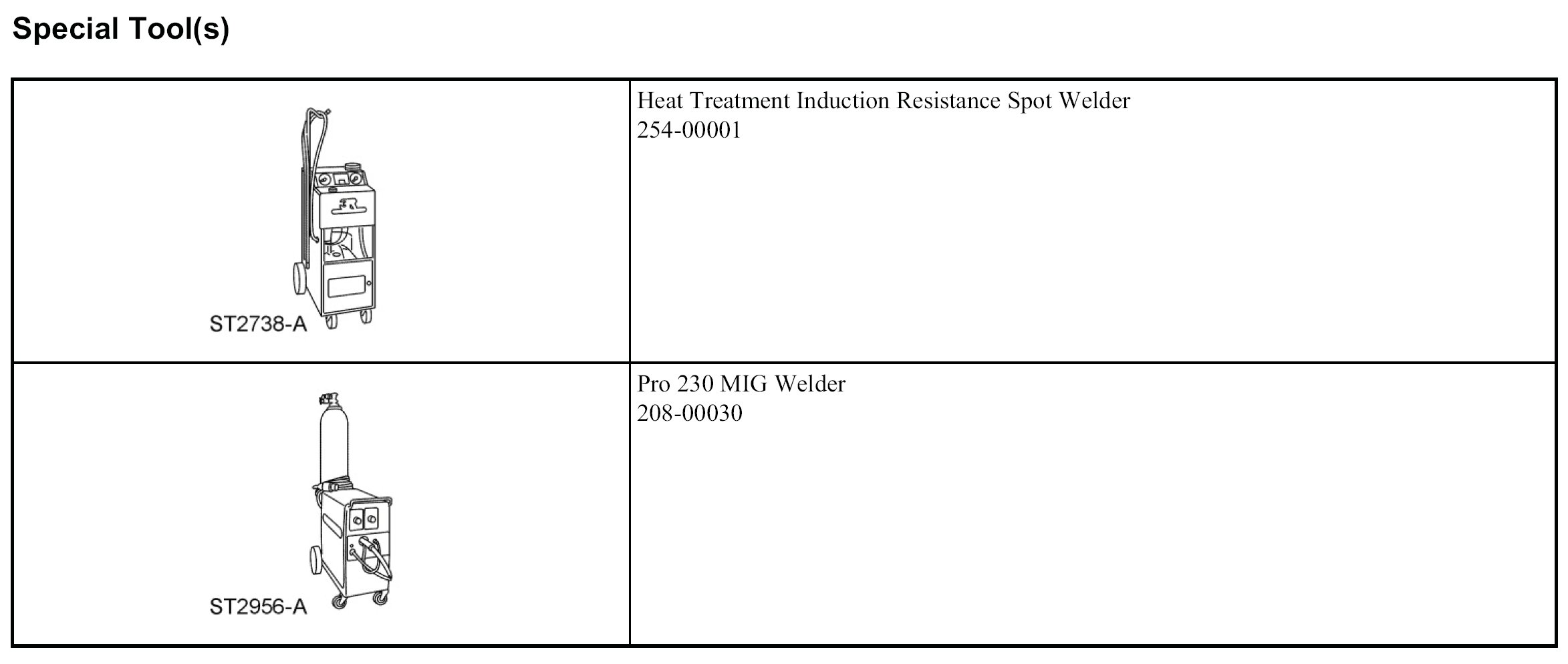 NOTE: Factory spot welds may be substituted with either resistance spot welds or Metal Inert Gas (MIG) plug welds. Spot/plug welds should equal factory welds in both location and quantity. Do not place a new spot weld directly over an original weld location. Plug weld hole should equal 8 mm (0.31 in) diameter.