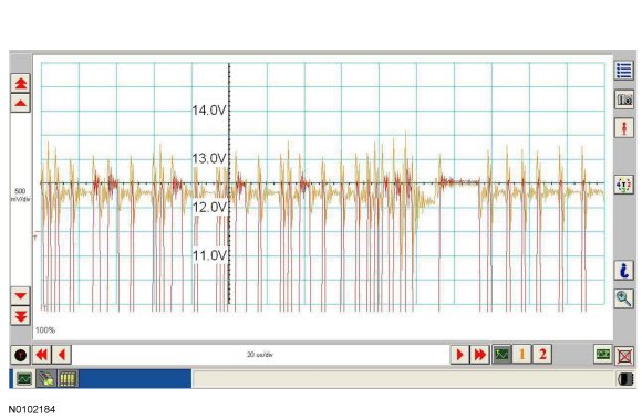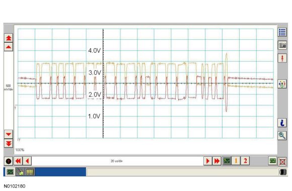 NOTE: The oscilloscope traces below are from the Integrated Diagnostic System (IDS) oscilloscope taken using the IDS (Integrated Diagnostic System) pre-configured Controller Area Network (CAN) settings. The traces are for both data (+) and data (-) taken simultaneously (2-channel) at a sample rate of 1 mega-sample per second (1MS/s) or greater.