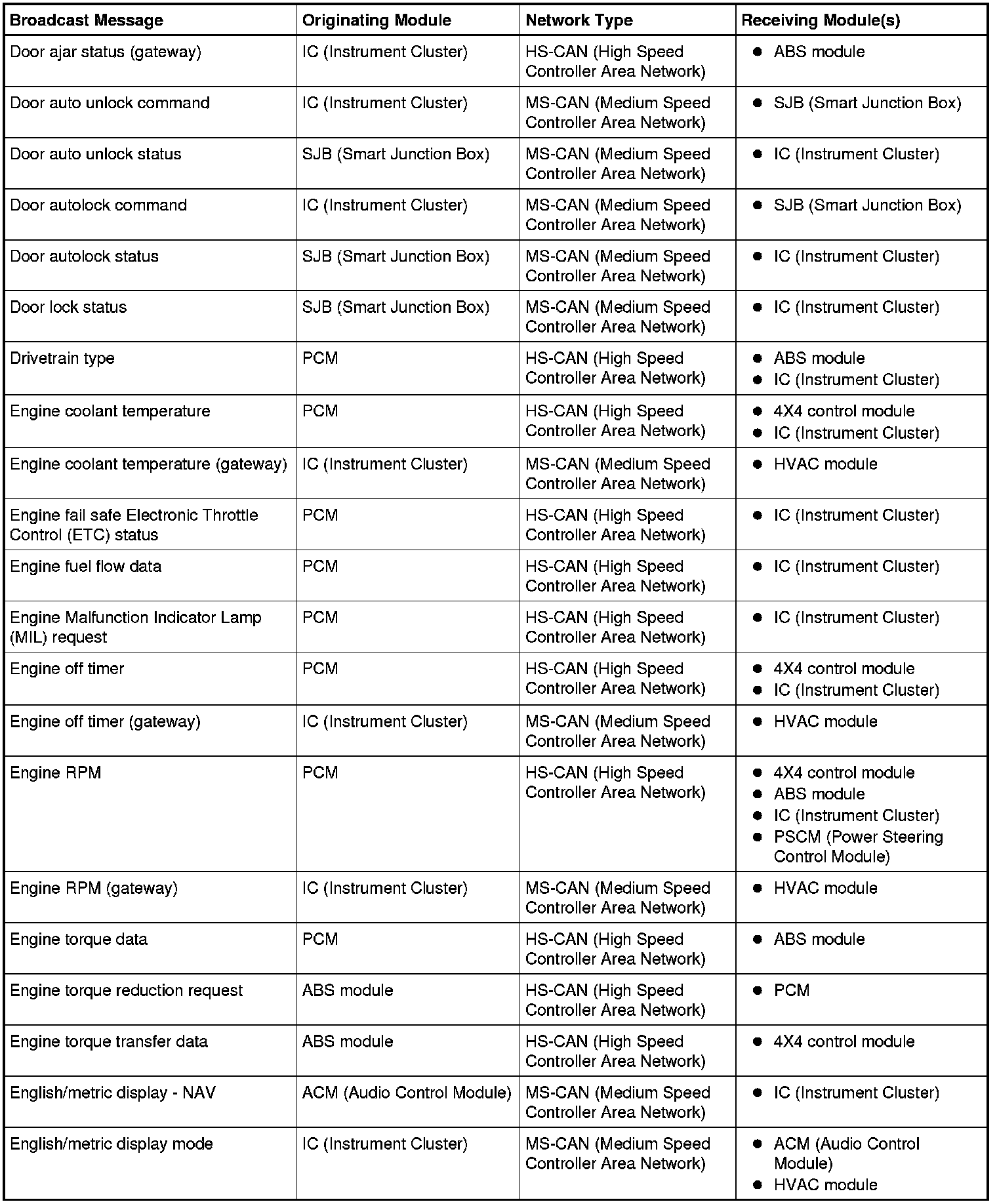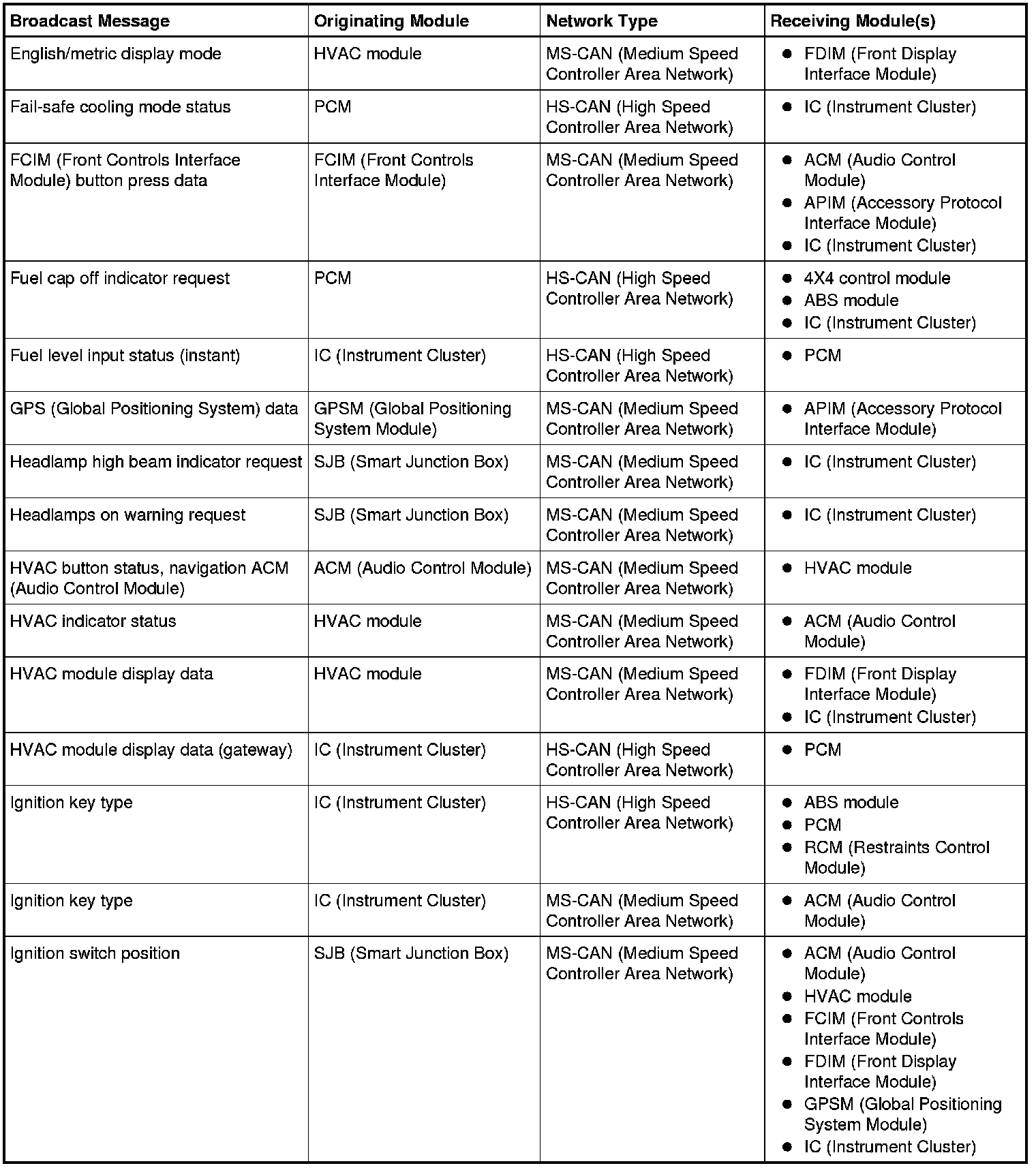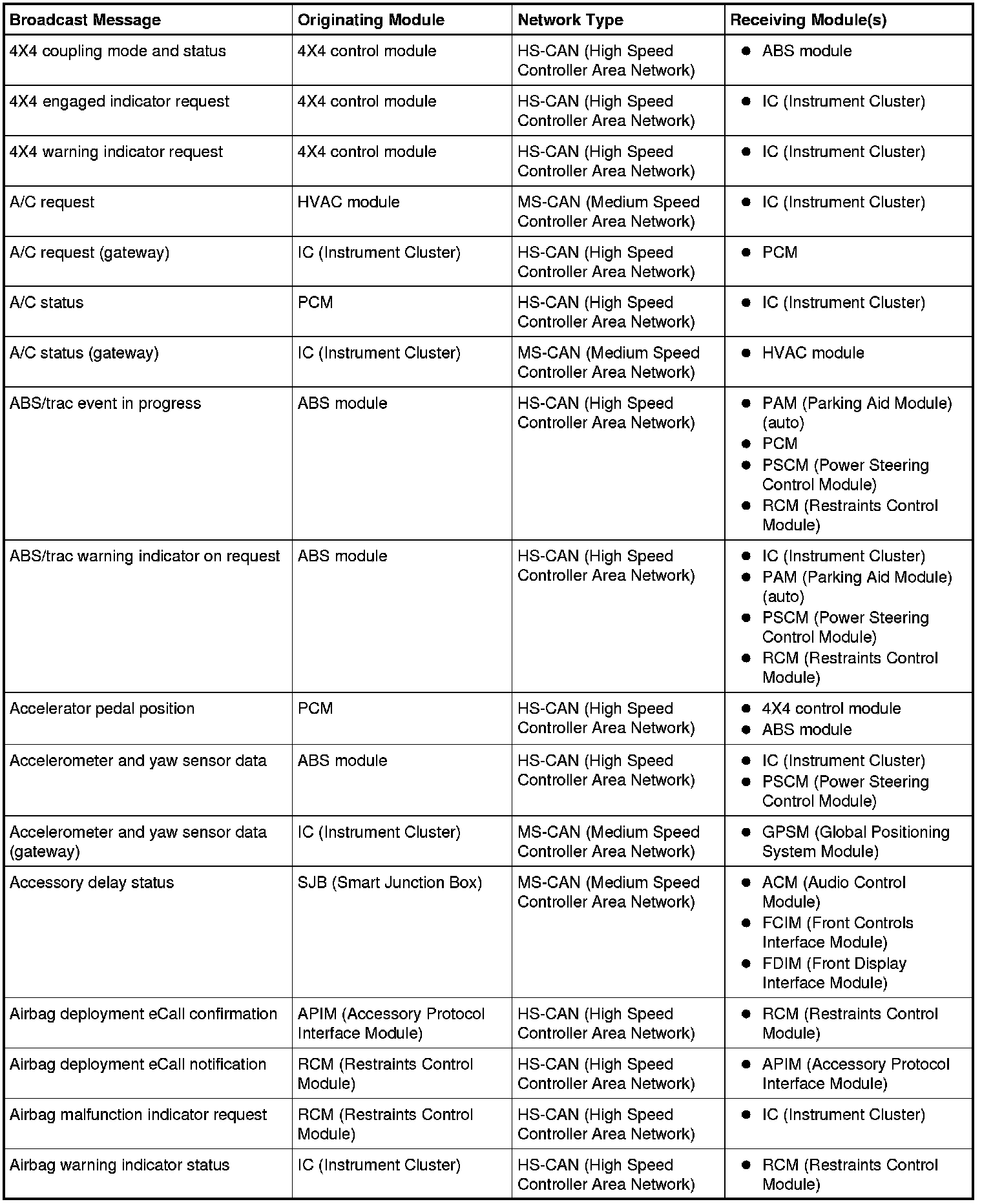 Modules on the CAN (Controller Area Network) utilize simultaneous communication of 2 or more messages on the same network circuits. The following chart summarizes the messages sent and received on the network.