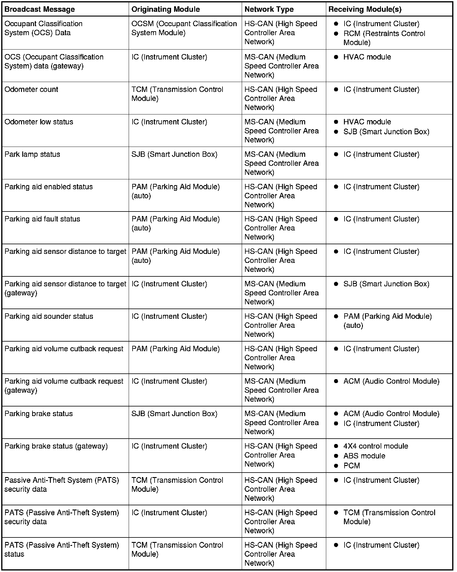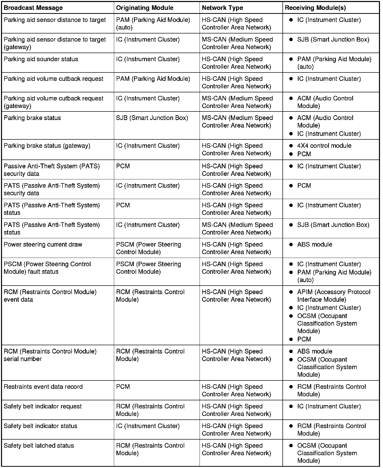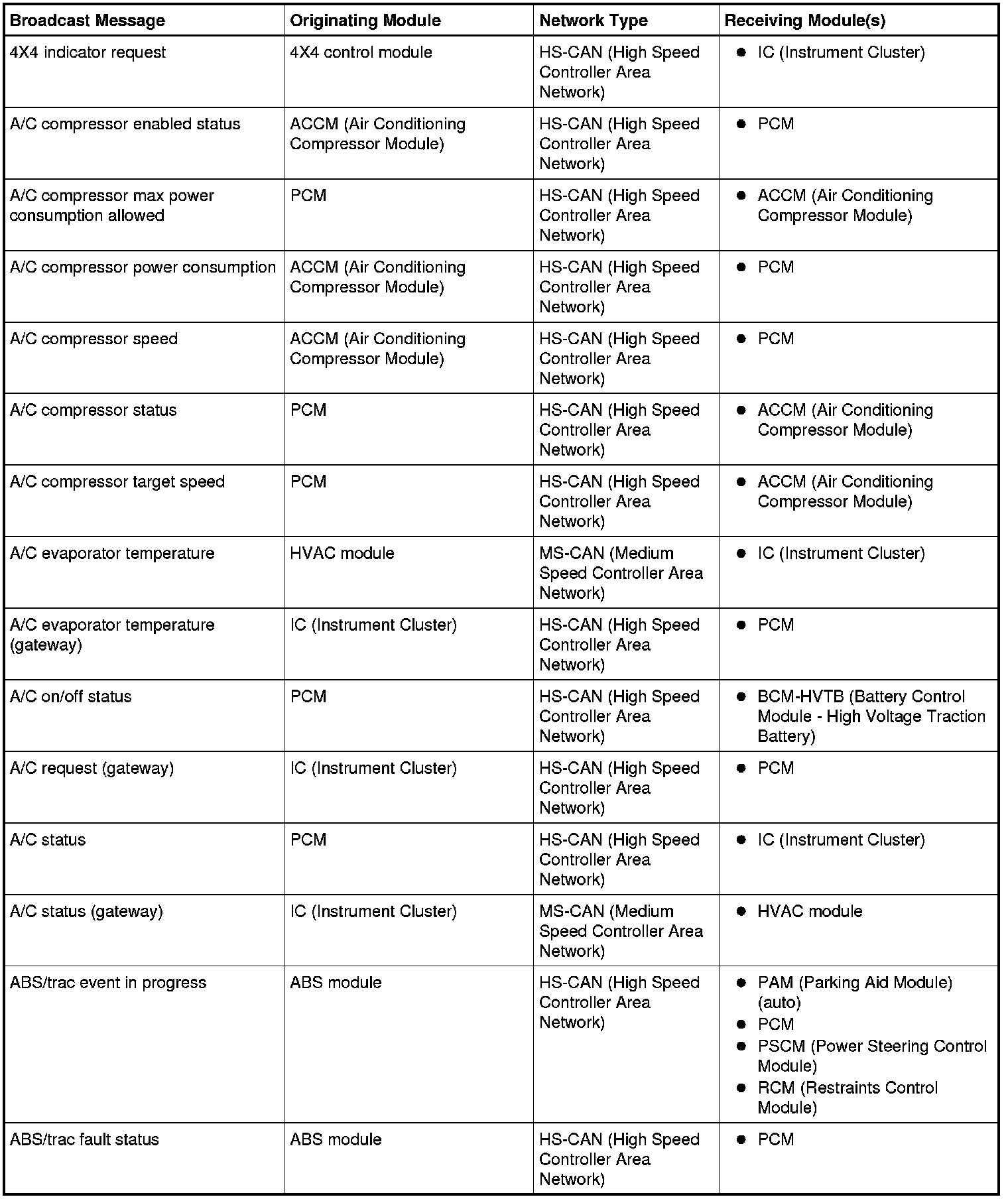 Modules on the CAN (Controller Area Network) utilize simultaneous communication of 2 or more messages on the same network circuits. The following chart summarizes the messages sent and received on the network.