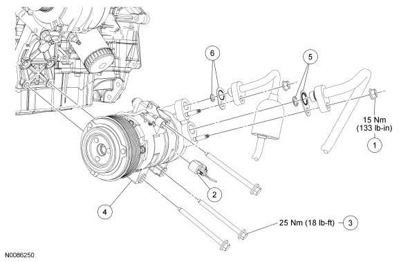 5. Remove the A/C compressor suction and discharge fitting nuts and disconnect the fittings.