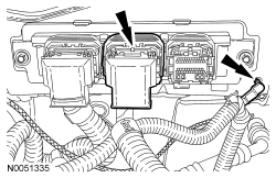 57. Disconnect the engine electrical connector from the PCM and remove the retainer from the bulkhead.