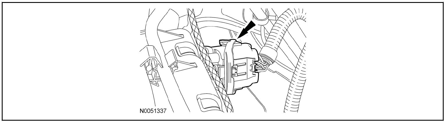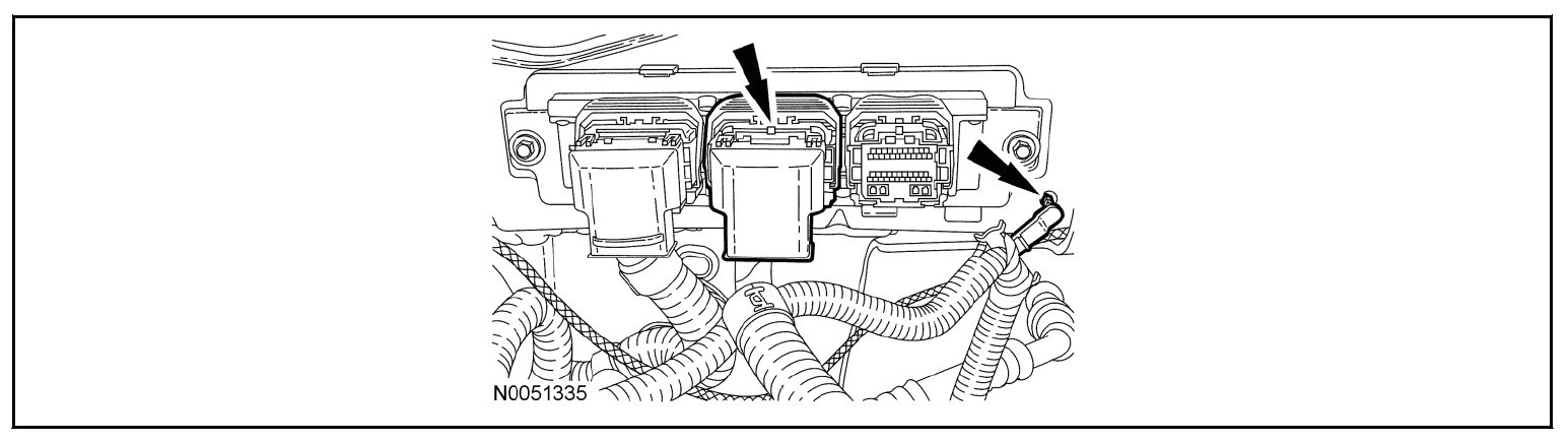 57. Disconnect the engine electrical connector from the PCM and remove the retainer from the bulkhead.