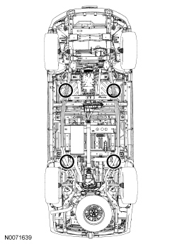 NOTICE: Damage to the suspension, exhaust or steering linkage components may occur if care is not exercised when positioning the hoist adapters prior to lifting the vehicle.