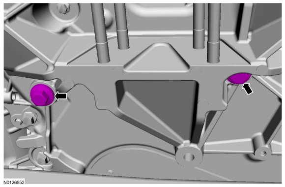 2. NOTICE: Place clean, lint-free shop towels over exposed engine cavities. Carefully remove the towels so foreign material is not dropped into the engine. Any foreign material (including any material created while cleaning gasket surfaces) that enters the oil passages or the oil pan, may cause engine failure.