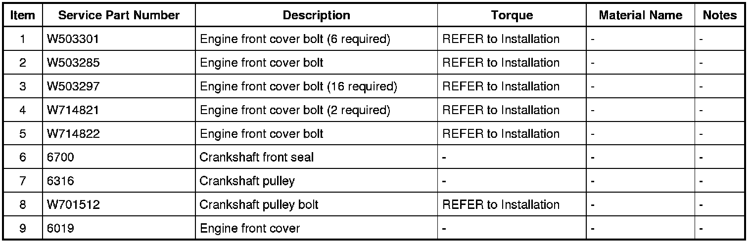 NOTE: The engine front cover and bolts 7, 8, 15, 17, 18, 21 and 22 must be installed within 4 minutes of the initial sealant application. The remainder of the engine front cover bolts must be installed and tightened within 35 minutes of the initial sealant application. If the time limits are exceeded, the sealant must be removed, the sealing area cleaned and sealant reapplied. To clean the sealing area, use Motorcraft(R) Silicone Gasket Remover and Motorcraft(R) Metal Surface Prep. Failure to follow this procedure can cause future oil leakage.