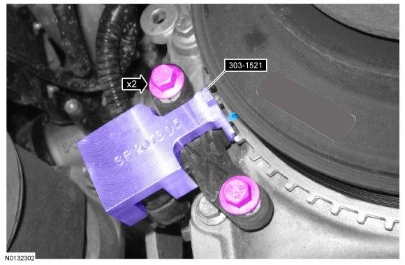 3. Install the 303-1521. If the 303-1521 does not align with the TDC (Top Dead Center) marked tooth on the crankshaft pulley, loosen the 2 CKP (Crankshaft Position) sensor bolts and adjust the sensor until the tool is installed.