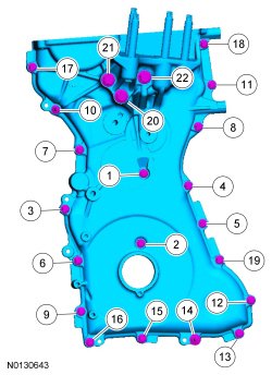 Install the engine front cover, the 21 bolts and the stud bolt.