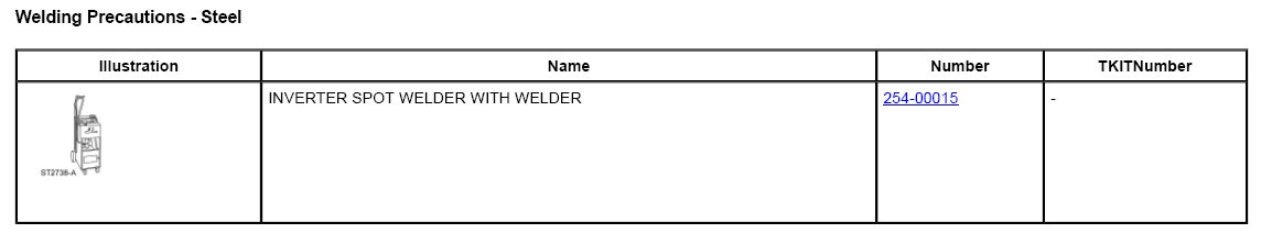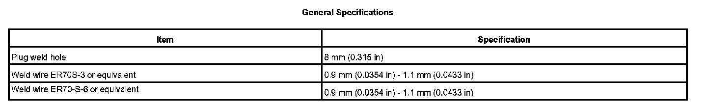 - Factory spot welds may be substituted with either STRW or MIG plug welds. Spot/plug welds should equal factory welds in both location and quantity. Do not place a new spot weld directly over an original weld location. Plug weld hole should equal 8 mm (0.315 in) diameter.