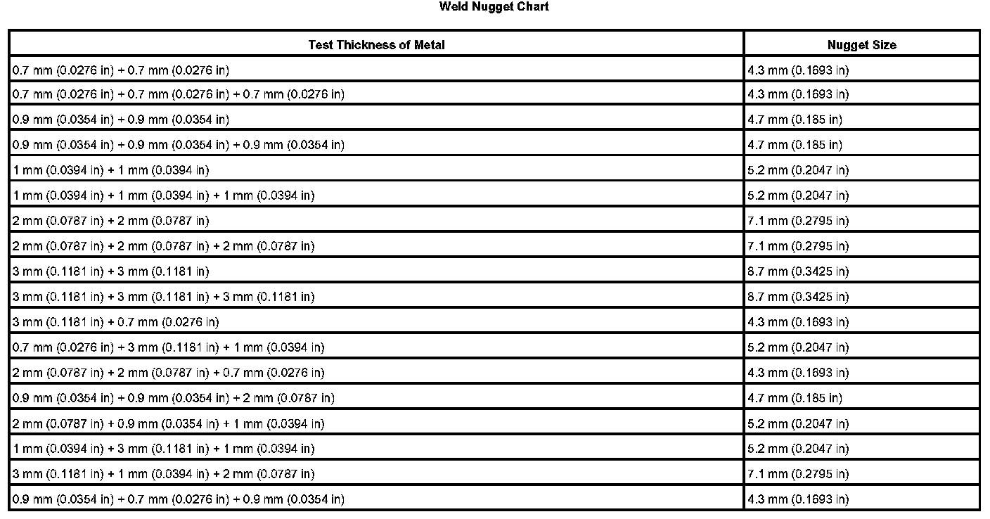 NOTE: When carrying out test welds using MIG plug welding or STRW techniques, refer to the weld nugget chart above.