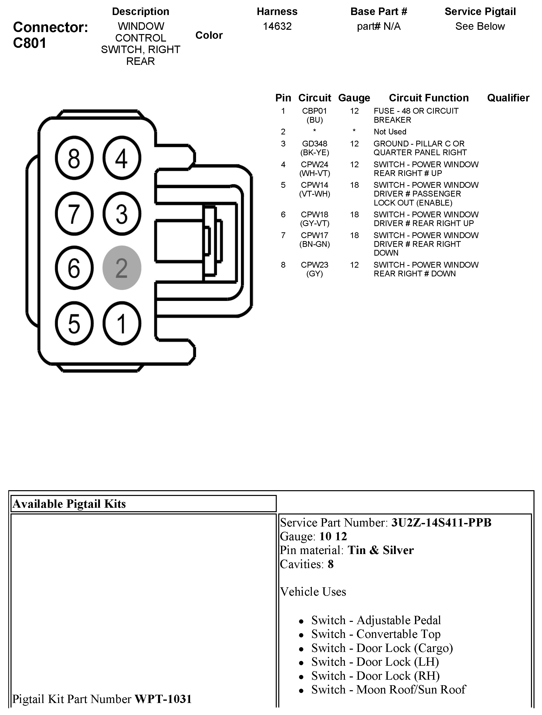 C801 Window Control Switch, Right Rear