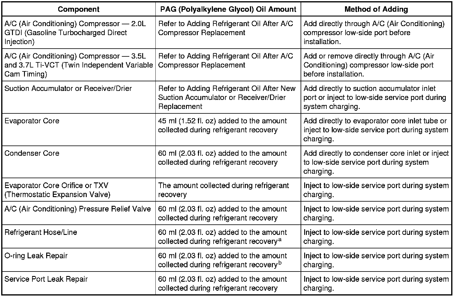 b The amount specified may be used for one or multiple O-ring leak repairs. Do not multiply the PAG (Polyalkylene Glycol) oil amount by the number of O-ring leaks being repaired.